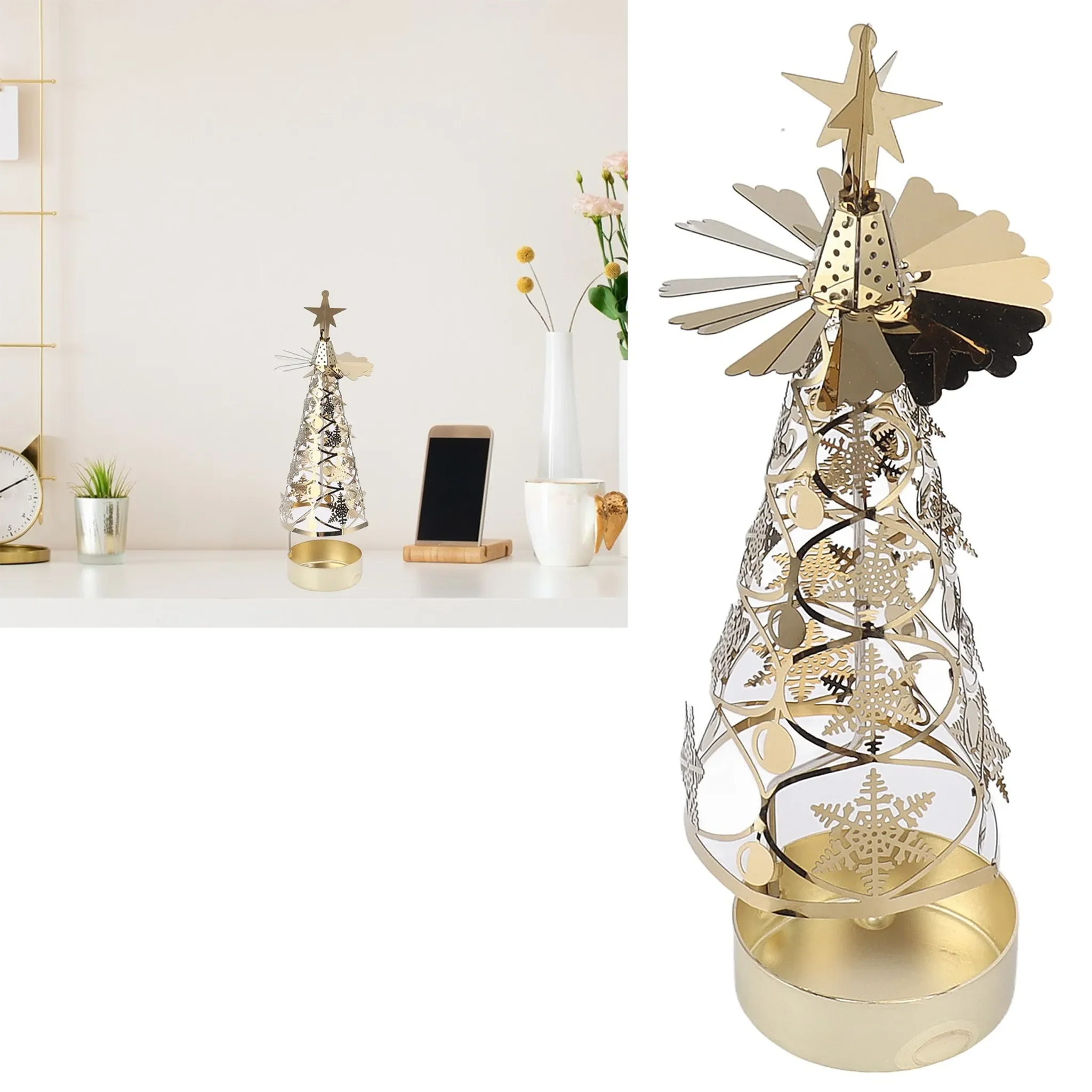 Dieser drehbare Kerzenhalter überzeugt durch sein innovatives Design und erzeugt faszinierende Licht- und Schatteneffekte. Sobald die Kerze brennt, reflektiert das rotierende Element das Kerzenlicht sanft im Raum und schafft eine warme, romantische Atmosphäre.