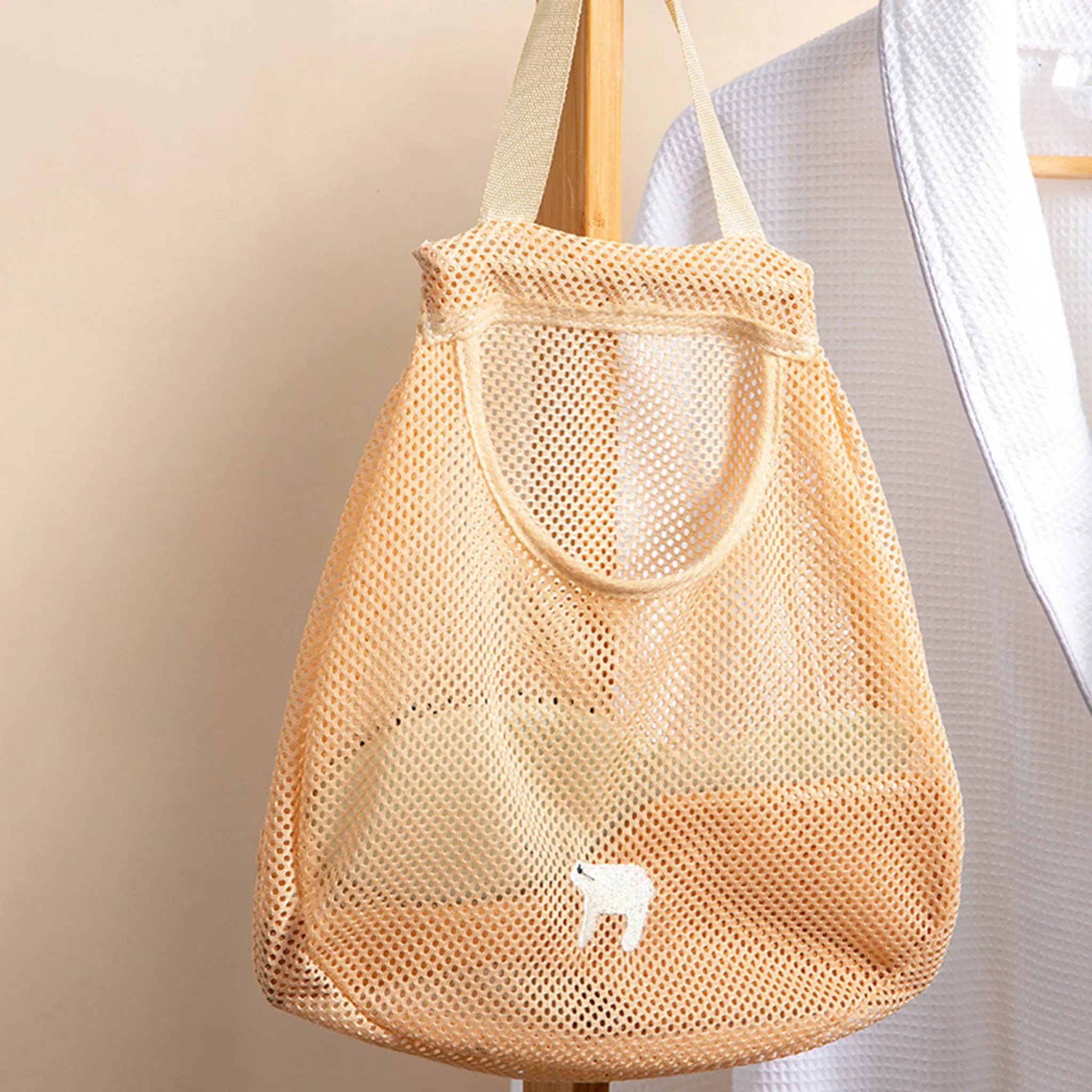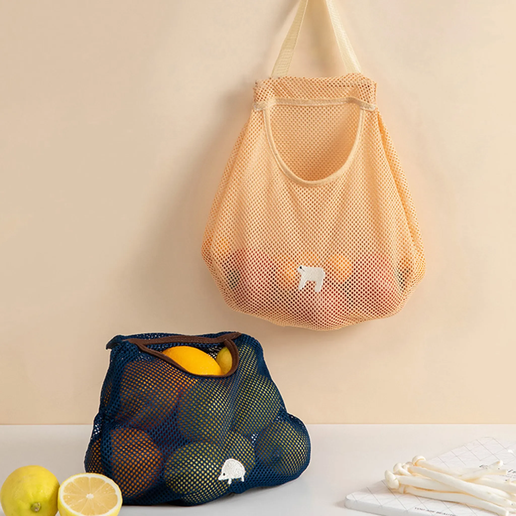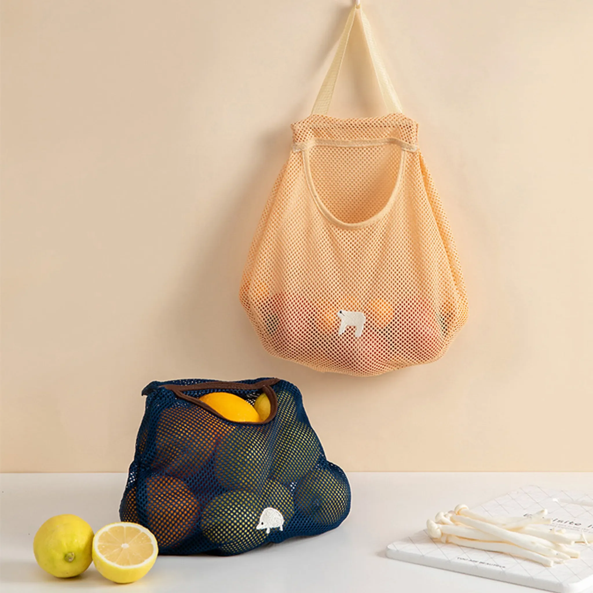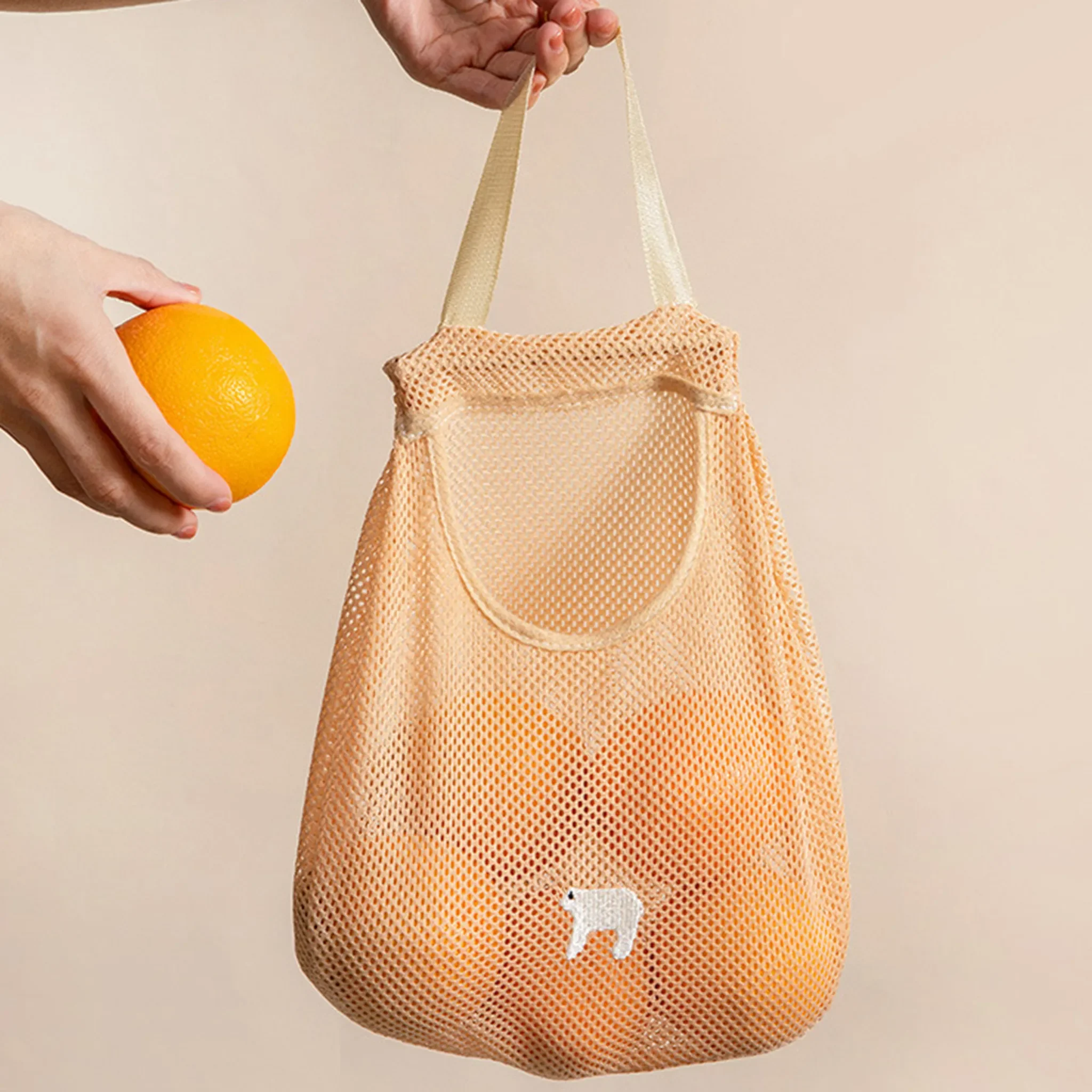 Diese wiederverwendbare Mesh-Aufbewahrungstasche ist eine praktische Lösung für die Küche. Das atmungsaktive Polyesternetz mit hohlem Design sorgt für optimale Belüftung und eignet sich ideal zur Aufbewahrung von Obst und Gemüse.