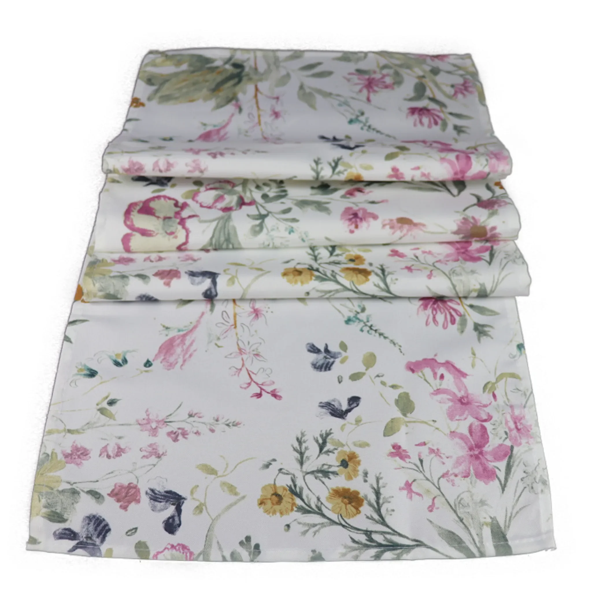 Dieser Tischläufer im Landhaus-Stil bringt mit seinem farbenfrohen Blumenmotiv eine frische, natürliche Atmosphäre in Ess- und Wohnbereiche. Der hochwertige Digitaldruck zeigt eine detailreiche Blumenwiese in harmonischen Weiß-, Grün-, Violett- und Rosatönen.